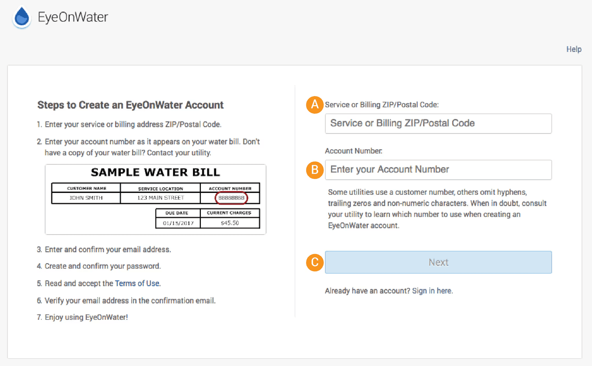 - Register your smart meter with your 15-digit service account number from your water bill.